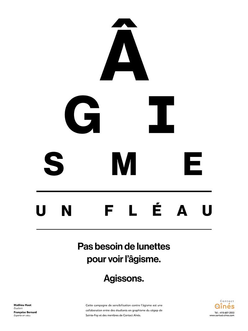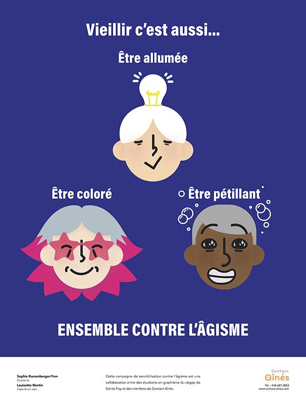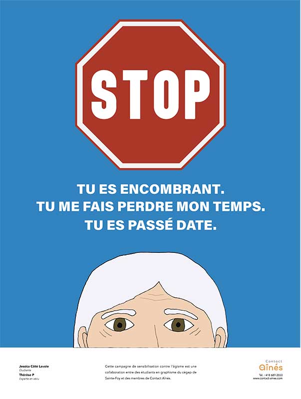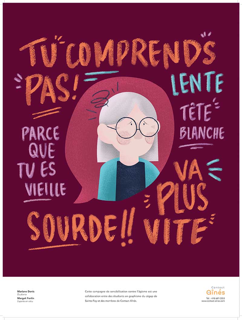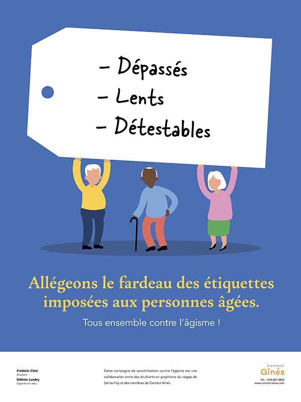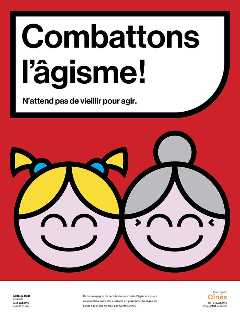 Un projet plus particulier a pris naissance dans ce club intergénérationnel avec la création d’une campagne de sensibilisation sur l’âgisme. Tout a commencé par deux témoignages d’aînées qui ont subi des comportements âgistes ainsi que des propos violents de la part de tierces personnes comme : « Tu ne peux pas comprendre parce que tu es vieille !!! », « Tu es passée date, tasses toi la vieille !!! ». À la suite de ces déclarations, une forte indignation générale était palpable, les premiers mots furent : « intolérable, inacceptable !!! ». De ce fait, nous savions qu’il fallait agir contre ces comportements d’âgisme (définition : c’est l’ensemble des stéréotypes, des préjugés et de la discrimination basée sur l’âge) au sein de notre communauté. Nous avons effectué une collaboration avec le Cégep Sainte-Foy, programme DEC graphisme en partenariat avec le Studio Jeune Coop. La création des affiches s’est déroulée en binôme intergénérationnel (une aînée – un étudiant) où chacun a pu s’exprimer.